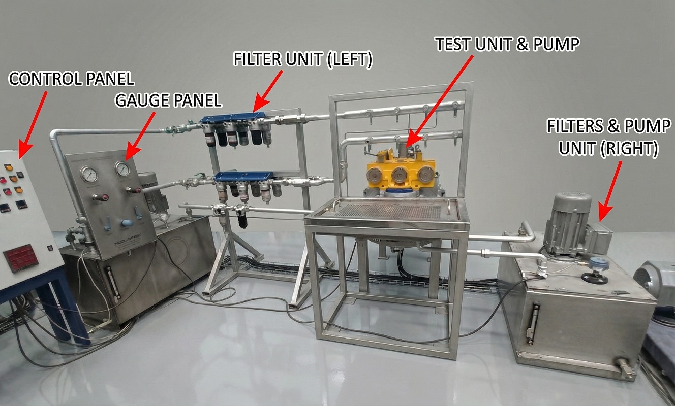 • Production acceptance testing of aircraft aggregates to validate internal cleanliness and flow behaviour. • MRO (Maintenance, Repair & Overhaul) flushing of aggregates after disassembly and reassembly cycles. • Restoration and life-extension flushing to remove accumulated contaminants and extend aggregate service life. • Diagnostic flushing during failure investigation to detect internal clogging, flow restriction or abnormal behaviour. • Dynamic operational simulation of aggregates using controlled ATF flow, pressure, temperature and rotation. • Deep cleaning of fine-tolerance aviation components such as servo valves, hydraulic pumps and actuation units. • Removal of micro-scale contaminants (10–15 microns) that can obstruct lubrication passages and precision clearances. • Ensuring aggregates meet aviation cleanliness standards before installation, dispatch or certification.