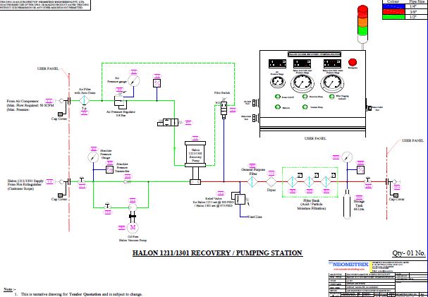 Introduction The Halon Reclamation & Refilling Facility (HRRF) by Neometrix Engineering is a fully integrated, turnkey solution engineered to recover, purify, and recharge Halon-1211 and Halon-1301 fire-suppression agents. At its core, the HRRF automates a closed-loop process: spent Halon is evacuated to deep vacuum, routed through three-stage filtration (acid removal, moisture trap with indicator, particulate filter), then through cascaded refrigeration (down to –70 °C for Halon-1301, –20 °C for Halon-1211) with non-condensable gas venting. An embedded PLC/HMI orchestrates every sequence with safety interlocks and real-time alarms, while IoT-enabled remote monitoring tracks pressure, temperature, flow, and purity to optimize uptime and lifecycle costs. Integrated gas chromatography, mass spectrometry, moisture titration, residue testing, and boiling-point analysis certify each batch to ISO 7201 and ASTM D7673, ensuring reclaimed Halon matches virgin stock in performance and compliance. Technical Specifications