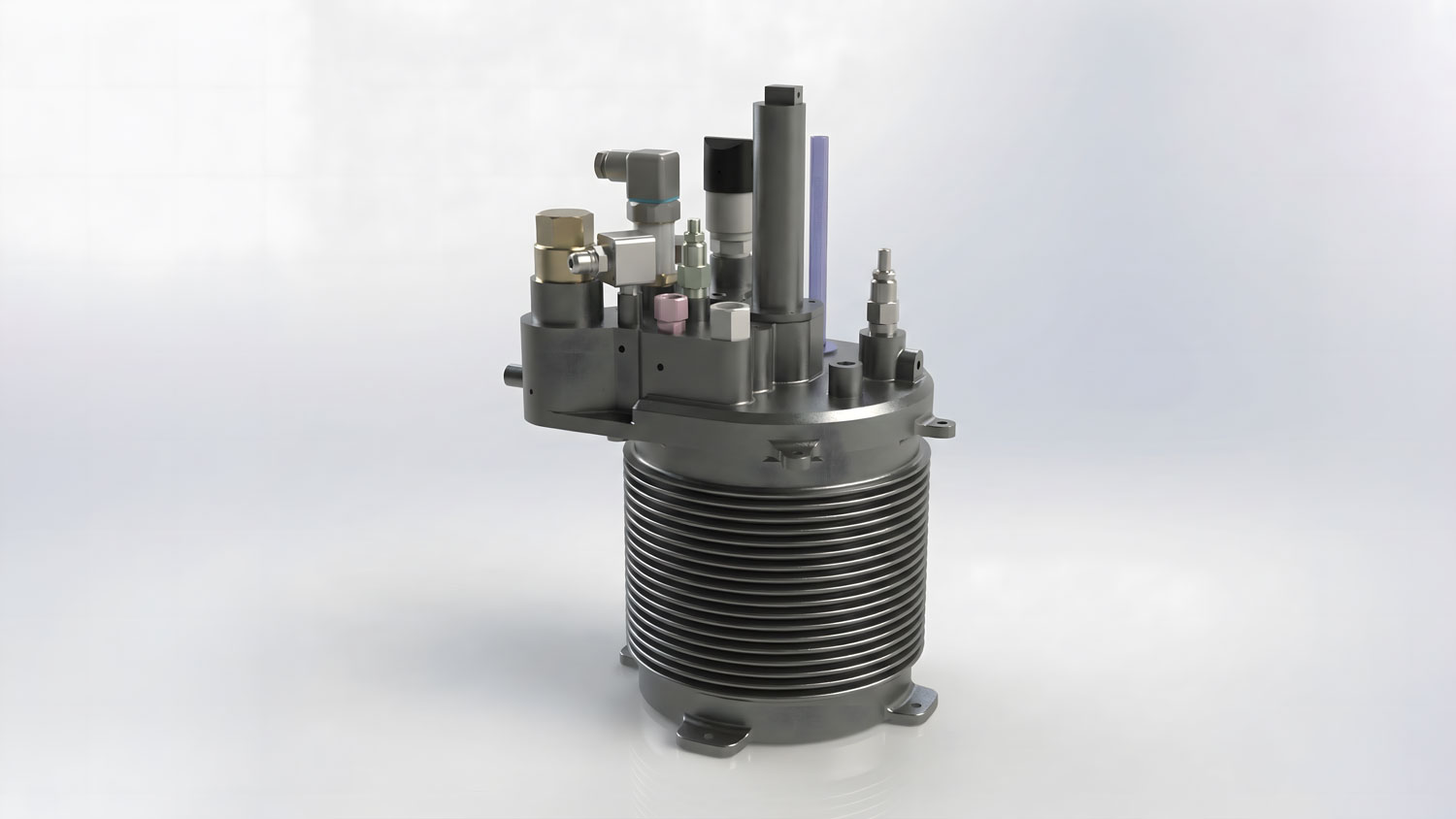 1. Introduction – Why This Module Is Critical In a modern combat or utility helicopter, the hydraulic system is the nervous system of the aircraft. Every change in main-rotor pitch, every tail-rotor correction, every landing-gear cycle, every brake application, and every deployment of mission equipment ultimately depends on one thing: a stable, uninterrupted supply of hydraulic power. The Integrated Aircraft Hydraulic Reservoir, Intensifier & Control Module is the unit that guarantees this. It does far more than store oil; it actively ensures that the hydraulic pump is never starved of fluid, even when the aircraft is pulled into aggressive pitch, roll, yaw, or negative-G maneuvers where conventional reservoirs start gulping air and collapsing suction pressure. Instead of a simple tank-and-filter stack, this module is a self-pressurising reverse-intensifier bootstrap reservoir that continuously maintains around 2.5 bar(g) at the pump suction, irrespective of flight attitude, fluid slosh, or fast transients from flight-control and utility actuators. A drop in suction pressure here doesn’t just show up as a bad number on a gauge – it turns into cavitation, actuator lag, spongy controls and, in the worst case, loss of controllability. By integrating the reservoir, intensifier, high- and low-pressure relief valves, check valves, filtration, fluid-level sensing, and temperature/pressure monitoring into a single aerospace-grade module, the system eliminates long runs of pipework and multiple failure points. It becomes a single, tightly controlled assurance point for the entire hydraulic system on advanced helicopter and aircraft platforms. 2. System Overview & Functional Role The Integrated Aircraft Hydraulic Reservoir, Intensifier & Control Module is a compact hydraulic power-conditioning module designed for multi-circuit aircraft hydraulic systems, typically with separate flight-control and utility hydraulic circuits. Two main reservoir configurations are used: • 2.75 L module – typically used on primary flight-control systems (main and tail rotor actuators). • 4.25 L module – typically used on utility systems (landing gear, wheel brakes, hoists, winches, etc.). Within a single integrated assembly, it combines: • Self-pressurised bootstrap reservoir • Differential-area piston intensifier for reservoir pressurisation • High-pressure and low-pressure relief valves • Pressure and return filters with automatic shut-off and clog indication • Pressure transducer and pressure switch • Temperature switch for fluid thermal monitoring • Mechanical level gauge and low-level proximity sensor • Check valves, bleed valve, and service/ground quick-disconnects • A top manifold block acting as the distribution node for all hydraulic ports The module is flange-mounted on a 250 × 250 mm base and designed to fit within tight height and weight envelopes, allowing direct integration into the aircraft hydraulic bay. 3. Architecture & Major Sub-Assemblies 3.1 Self-Pressurised Bootstrap Reservoir • Two reservoir sizes: 2.75 L and 4.25 L maximum fluid volume. • Useful working volumes: approx. 2.50 L and 4.00 L, with the remaining volume reserved for thermal expansion and emergency capacity. • Vertically mounted cylindrical reservoir, with cooling fins on the low-pressure (LP) chamber to improve heat dissipation during continuous operation. • Internal geometry and the fluid-level indication arrangement are designed to avoid air entrapment and give correct level readings during ground checks and in various aircraft attitudes. • An air filter/breather is provided on the LP side to minimise contamination ingress when exposed to atmosphere. 3.2 Differential-Area Intensifier Assembly Key dimensional characteristics: • Low-pressure piston diameter (D): 180 mm • High-pressure piston diameter (d): 25 mm • Piston rod diameter (Rd): 15.318 mm • Area ratio (LP side : HP side): ≈ 82.4 : 1 • Maximum stroke – 2.75 L version: ≈110 mm (gives ~2.75 L max volume, 2.50 L rated, 1.25 L emergency) • Maximum stroke – 4.25 L version: ≈168 mm (gives ~4.25 L max volume, 4.00 L rated, 1.25 L emergency) High-pressure fluid from the pump acts on the small-area piston, and this force is transmitted through the rod to the large-area piston acting on the reservoir fluid, creating stable positive suction pressure. 3.3 Valve & Filtration Manifold Mounted on the reservoir top, the manifold integrates: • High-pressure relief valve (two-stage, cartridge type) ▹ Opens at approximately 1.25–1.33 × nominal system pressure to protect the system from over-pressure. ▹ Sized to pass full pump flow (~25 L/min). • Low-pressure overboard relief valve ▹ Protects the reservoir and LP chamber from over-pressurisation due to return-line blockage or thermal expansion. ▹ Vents to atmosphere at approximately 4–5 × normal return pressure, also for full pump flow. • Pressure filter (without bypass) ▹ Located in the system pressure line. ▹ Automatic shut-off prevents draining the reservoir when the filter element is removed. ▹ Integrated clog indicator gives early warning of restriction. • Return filter (with bypass) ▹ Located in the return line to the reservoir. ▹ Automatic shut-off and clog indicator. ▹ Bypass function ensures continued flow even when the element is clogged, while still signalling the maintenance requirement. • Check valves ▹ In the pump pressure line (unfiltered branch) to maintain pressure on the intensifier and hence reservoir pressurisation after pump shutdown. ▹ In the pump case-drain line (with filter) to control back-flow and protect the pump internals. 3.4 Sensors & Instrumentation • Pressure transducer for continuous monitoring of system pressure. • Pressure switch for discrete pressure alarms and redundancy. • Temperature switch to protect against excessive hydraulic fluid temperature. • Mechanical fluid-level indicator visible durin