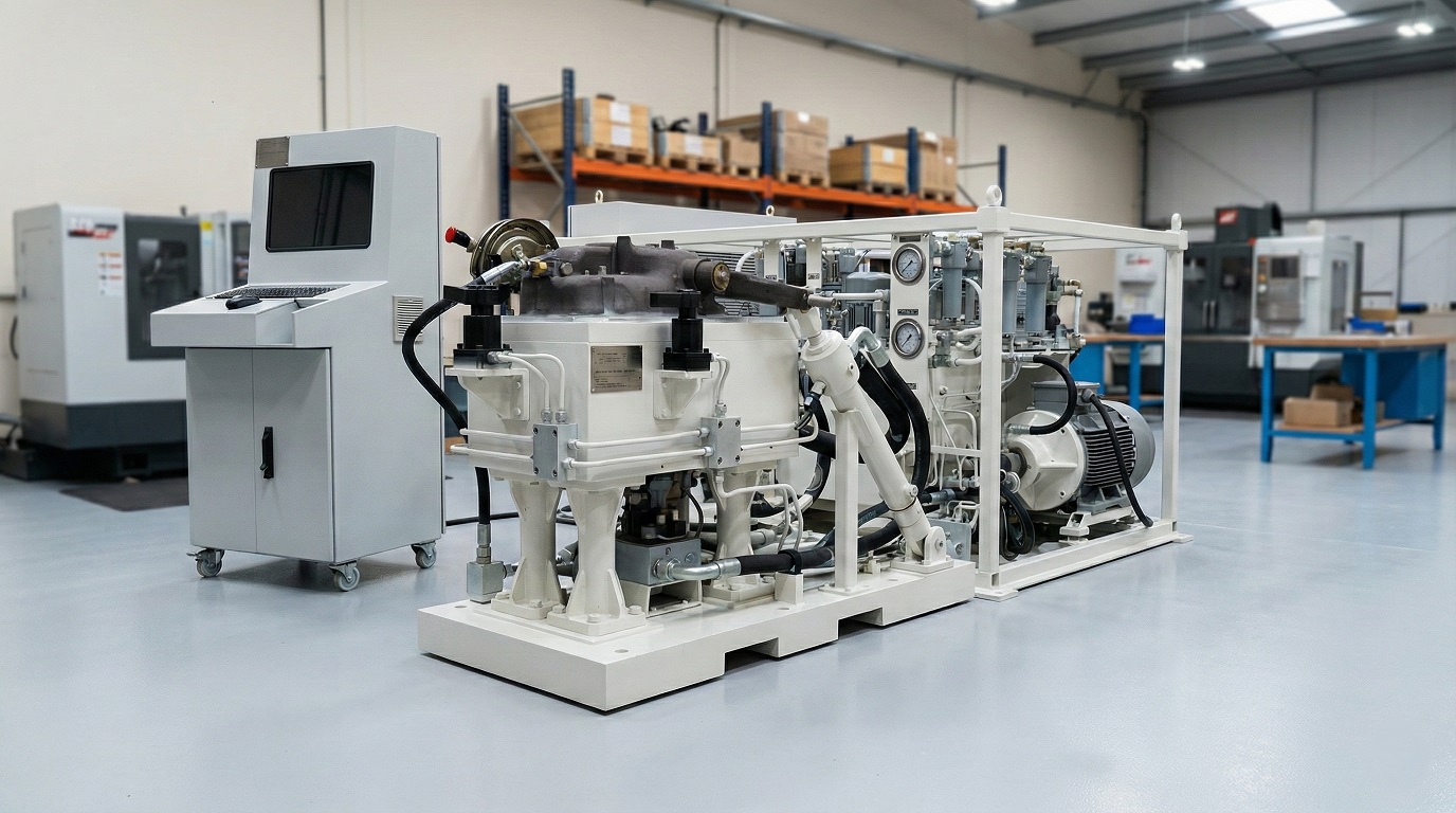 Introduction Rear Cover Hydraulic Test Rig (Electro-Hydraulic Functional Test Bench) In any hydraulic assembly where the rear cover also governs valve behavior, tiny deviations don’t stay “tiny” for long. A few bar of pressure error, a sluggish response valve, an unnoticed free play band, or inconsistent drop/hunting behavior can turn into real field failures: unstable motion, slow or non-repeatable actuation, overheating, seal damage, premature wear, nuisance trips, or in the worst case—unsafe machine behavior under load. That’s exactly why this Rear Cover Test Rig exists. It is not just a pump-and-gauge setup; it’s a controlled, repeatable verification environment that forces the unit under test to demonstrate correct functional behavior across low-flow and high-flow conditions, pressure thresholds, timing windows, and stability checks—while recording the evidence digitally. By combining a high-pressure hydraulic supply, regulated flow control, calibrated measurement, model-wise test recipes, operator interlocks, and automated pass/fail reporting, the system closes the gap between “it seems to work” and “it is proven to work, every time, on every unit.” Rear cover: what it is and where it is used A rear cover is the end-cap / end-plate assembly bolted to the rear side of a hydraulic unit (typically a pump, motor, or a hydrostatic drive/transmission module). In many modern designs, it’s not just a protective cover—it is a functional hydraulic sub-assembly that contains precision oil passages and, often, integrated valve functions. What a rear cover typically does • Seals and closes the hydraulic housing, maintaining pressure integrity and preventing leakage. • Forms internal oil galleries/passages that route pressure, return, charge, and drain flows correctly. • Provides external interfaces (ports, test points, manifold connections, mounting features). • Supports internal components (bearing seats, alignment features, thrust/end surfaces). • Integrates control functions (depending on the design), such as: ▹ relief / pressure limiting functions ▹ response / modulation valves ▹ isolator / shut-off functions ▹ check / anti-cavitation functions ▹ damping features to prevent hunting/oscillation When these functions are integrated into the rear cover, it becomes a performance-defining component: small deviations in machining, valve setting, or internal leakage paths can directly impact response time, stability, lift/lower timing, pressure regulation, and overall safety. Where rear covers are used Rear covers are widely used in: • Hydraulic pumps (gear, vane, axial piston) — rear cover/end plate often carries porting and sealing surfaces; sometimes charge/relief functions. • Hydraulic motors — rear cover can integrate port routing, check/relief behavior, and case drain paths. • Hydrostatic transmissions (HST) / drive modules used in: ▹ tractors and harvesters ▹ skid steer loaders ▹ excavators and compact construction equipment ▹ industrial hydrostatic drives • Mobile hydraulics valve-integrated housings, where OEMs combine multiple functions into one compact end cover to reduce external plumbing and improve packaging. This is why rear cover testing is treated as functional validation, not just dimensional inspection—the test rig verifies how the rear cover behaves hydraulically under defined operating conditions. 1) What the machine does Purpose • Validates functional performance of rear cover models across defined flow conditions, pressure checks, timing checks, drop behavior (with response valve open/closed), and stability checks (hunting). • Uses computerized measurement and control so dynamic pressure/flow/temperature/time can be displayed, recorded, and reported. Models supported (as per the operator manual) The rig is set up to test four different models, and the operator must choose the correct model because each model has different parameters. Examples of model-wise functional coverage include: • CRE 735XJ: Lift movement @ 5 LPM; response valve pressure; free play; drop (response valve open/close); hunting; lifting time; lowering time. • CRE 735XJ (variant shown): Lift movement @ 16 LPM and @ 5 LPM plus the same core checks. • XM 744 / XM 843: Lifting checks at higher and low flows (e.g., 24/7 LPM, 16/5 LPM), with the same core checks; XM 843 additionally includes lifting check when isolator valve is closed. 2) System architecture (how it’s built) A) Main hydraulic system (UUT supply) This is the primary power pack delivering controlled flow/pressure to the UUT. Key hardware (from BOM): • Reservoir: 500 L, MS fabricated. • Main pump: Internal gear pump 46 LPM @ 2880 RPM, 250 bar (Rexroth AZPW series listed). • Drive motor: 20 kW, 2880 RPM, driven by VFD. • Pressure protection/control: Relief valve (0–250 bar), plus relief-cum-unloading valve set around 200 bar. • Duplex high-pressure filtration: 10 μm and 5 μm duplex assemblies with bypass option and electrical + visual clogging indication. • Instrumentation (primary): ▹ Pressure gauge (0–280 bar) with calibration certificate. ▹ Pressure transmitter 0–250 bar, 4–20 mA (Telemecanique listed). ▹ Flow meter 5–50 LPM with test certificate (Hydrotechnik UK listed) and stated as regulatable via VFD. Oil care & tank hardware (from BOM): • Level gauge + low/high level switches, suction strainers, drain valves, temperature gauge + RTD (4–20 mA). • Heaters: 4 kW, 3-phase, 440 VAC (listed). B) Cooling / temperature control loop To keep oil temperature under control, the BOM shows a dedicated cooling circuit: • Cooling line pump 40 LPM + motor + coupling; air radiator (STANHEX OC4-1 listed); low-pressure line filter with clogging indication. C) Loading & clamping system (fixture actuation and controlled loading) The rig includes a dedicated loading/clamping subsystem for consistent fixturing and controlled actuator behavior. Loadin