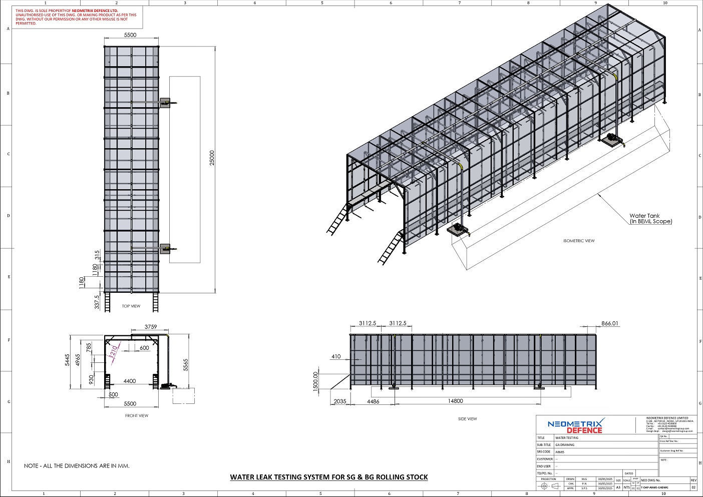 The Water Leak Testing System designed and manufactured by Neometrix Defence Limited is a state-of-the-art, full-scale facility developed to rigorously evaluate the watertightness of railway coaches and rolling-stock car bodies under simulated heavy-rainfall conditions.
